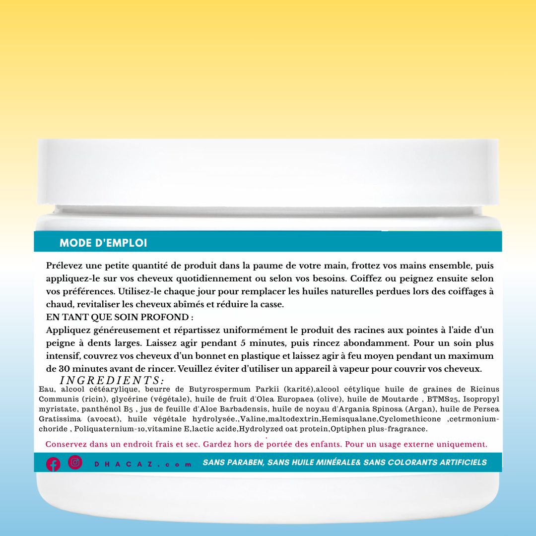 Conçu comme un traitement luxueux, il nourrit et revitalise vos cheveux de la racine aux pointes. Sa formule riche en ingrédients naturels pénètre en profondeur pour hydrater et adoucir, tout en renforçant la fibre capillaire. Le beurre de karité brut, associé à l'huile d'argan précieuse et à l'huile d'olive nourrissante, offre une hydratation intense, laissant vos cheveux soyeux et brillants.